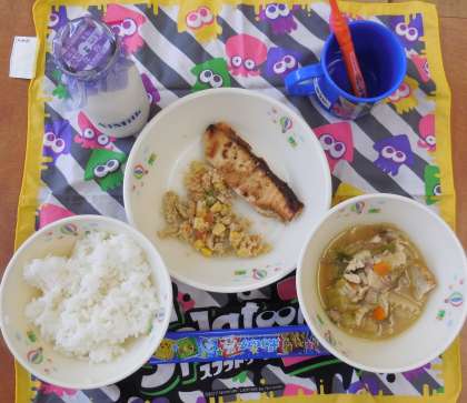 6年生の給食の時間の様子です。前面黒板の方を向き、静かに食べています。