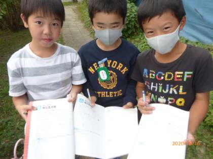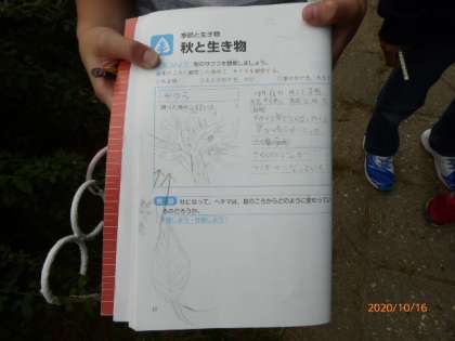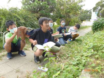 職員室前の花壇で4年1組の児童がヘチマの観察をしています。観察と実験ノートにていねいにヘチマの様子を記録しています。