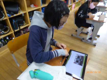 6年1組は修学旅行について調べ学習をしています。奈良公園にあるお寺にはどんなものがあるか、タブレットPCを使って情報を集めています。キーボードはありませんが、キーボードの画面をタッチペンで押したり、手書き入力する方法で使いこなしています。