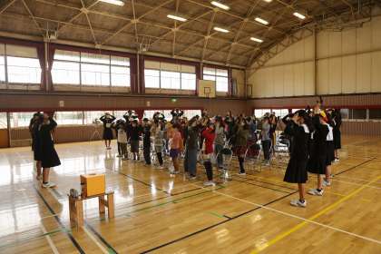 高校生のみなさんが自己紹介をした後、ウォームアップとして“Head Shoulders,Knees&Toes”“Simon Says”を一緒に歌いながら体を動かしました。