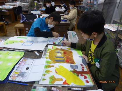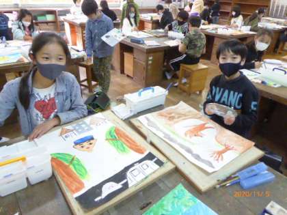 4年1組は読書感想画「大すきな物語」の完成間近です。見てみると新美南吉の「ごんぎつね」が多いようです。やはり名作ですね。みんな感動したようです。