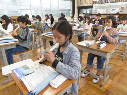 4年1組は音楽でリコーダー演奏をしています。曲はエーデルワイスです。よく音が出て、そろっています。しかし最後に失敗してしまいました。エーデルワイスの最後は余韻を残して、スーッと消えていかなければなりません。しかし、音を切ってしまったり、ゴトゴトとリコーダーを置く音がしてしまいました。そこでもう一度トライ!今度は美しくエンディングが決まりました。