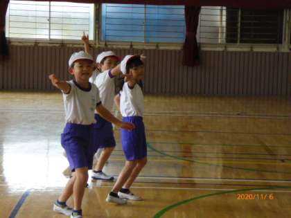 2年2組はダンスの発表会をしています。運動会で披露した「前向きダンス」の振り付けを自分たちで考えました。1番は運動会バージョン、2番は自分たちのオリジナルバーションです。