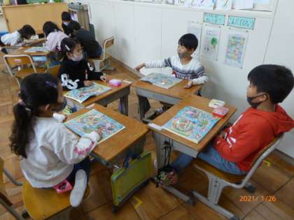 1年1組は算数の授業で、教科書の巻末にあるすごろくをしています。さいころを振って、出た目の数だけ進むと、〇マス進むとか、〇マス戻る、などと書いてあって、進んだり戻ったりと楽しんでます。すごろくを楽しみながら、100までの数について、しっかりと身につけることができますね。