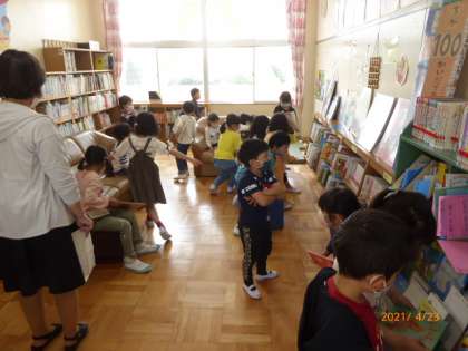 1年生の学校たんけんの続きです。最後は図書館に行きました。図書館で好きな本を見てもいいことにしました。低学年図書室も人気です。