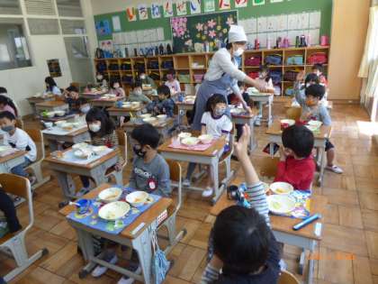 1年生の給食準備の様子です。今日も落ち着いて配膳を待つことができています。足りないものがあると手を挙げて先生に伝えています。