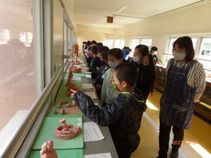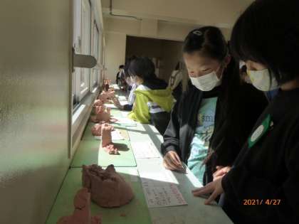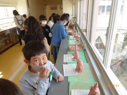4年1組は2階渡りで図工作品の鑑賞をしています。粘土作品はかなり乾燥していて、さわるのは厳禁です。作品カードを読みながらじっくりと見ています。