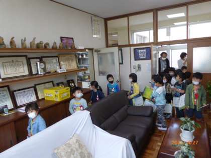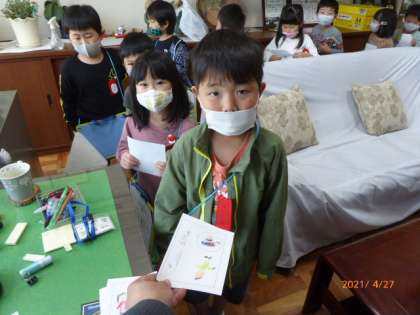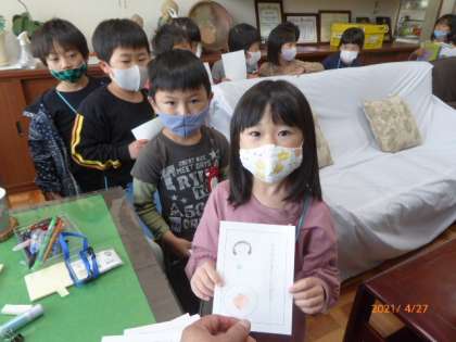 「失礼します」と校長室をたくさんの1年生が訪れました。みんな、校長先生に渡すために、一人一枚ずつ名刺を作って、自己紹介とともに手渡してくれました。