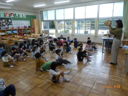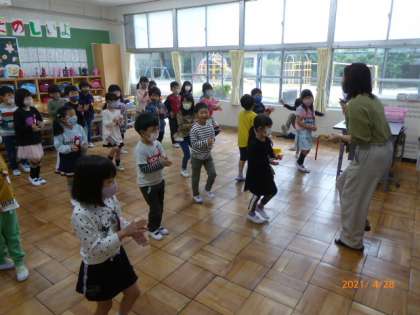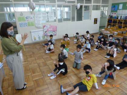 1年生の1時間目は音楽の先生の授業です。タンブリンに合わせて手を叩いたり、足で床を踏みならしたりします。続いて音楽に合わせて体を動かしました。とてもにぎやかな時間です。