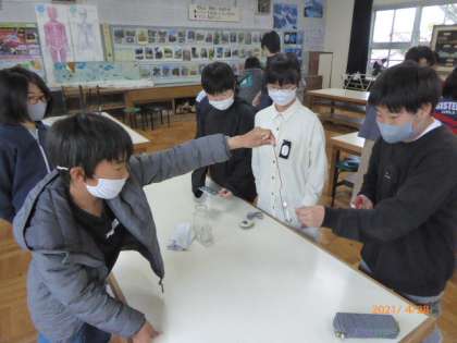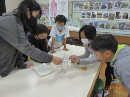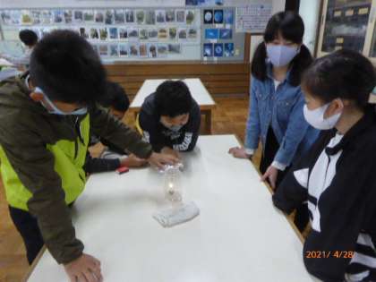 6年1組は理科室で実験をしています。ろうそくに火をつけて、びんの中に入れてふたをします。ふたをするとそのうちに火が消えてしまいます。何秒で火が消えるか、はかっています。