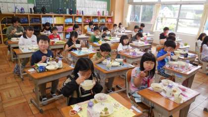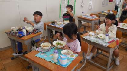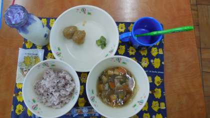 みだくさんじるの中には、ぶたにく、生揚げ、にんじん、ねぎ、だいこん、なめこ、ごぼうが入っていました。子どもたちの中には、その一つ一つをお箸で上手につかんで観察しながら食べている子もいました。