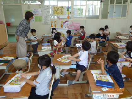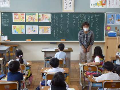 1年生はあいさつのことばについて勉強しています。あいさつだけでなく、物を手渡したりするときの「はい、どうぞ」「ありがとう」というやりとりも実際にやってみました。