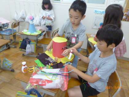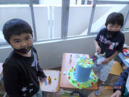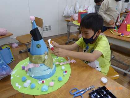 2年1組の図工「ぼうしをかぶって」の続きです。写真を撮っていると、「これが顔なんだよ〜」などと工夫したことを教えてくれます。