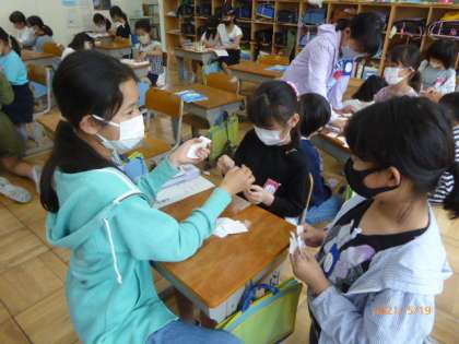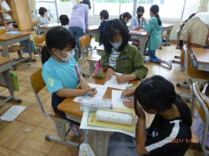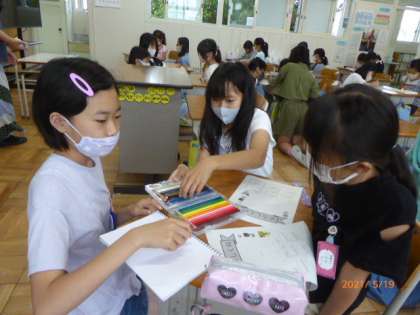 2年1組の教室にペアクラスの5年2組の児童が来て、ペア交流をしています。今日は「よろしくねカード」をいっしょにつくっています。