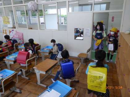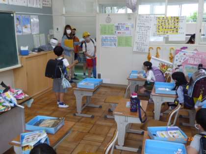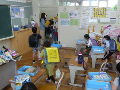 風水害避難訓練の続きです。放送の指示で班長さんが1年生を迎えに来ました。1年生を連れて通学団の教室へ行きます。