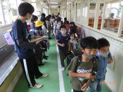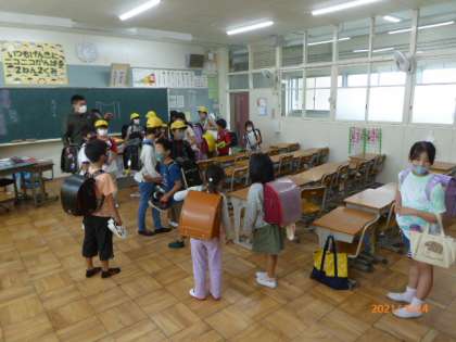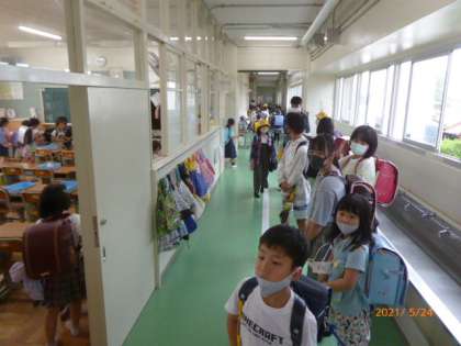 風水害避難訓練の続きです。1年生が全員班長さんに連れられていきました。それを確認してから、2〜5年生が移動を開始しました。教室は窓ガラスが割れることを想定して机が廊下側に寄せてあります。机のない床に座って並びます。