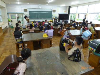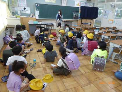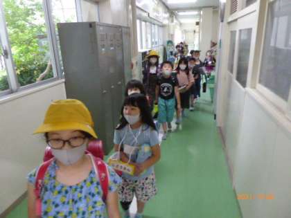 風水害避難訓練の続きです。すべての教室で人員確認ができました。次に、警報発表時にお迎えが来る人は図工室に、いつもとは違う他の通学団で帰る人はその通学団の教室へ移動しました。