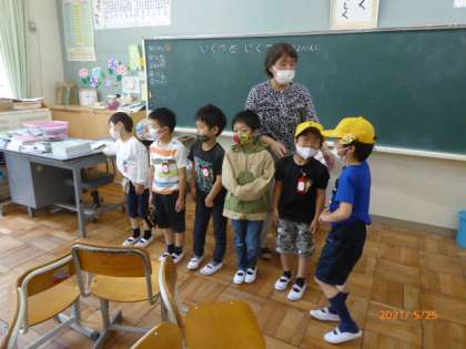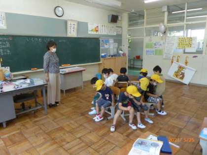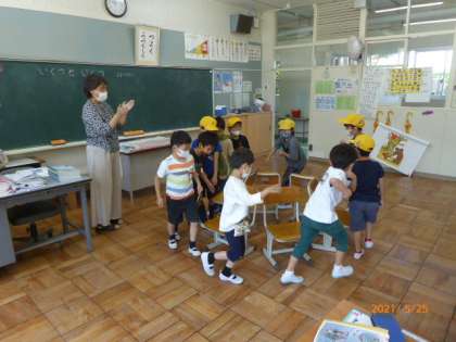 1年生は算数の勉強で、いす取りゲームを取り上げました。黄色い帽子をかぶっている子と、かぶっていない子でいす取りをします。いすに座れた人のうちで、帽子をかぶっている人とかぶっていない人の人数を数えて比べます。
