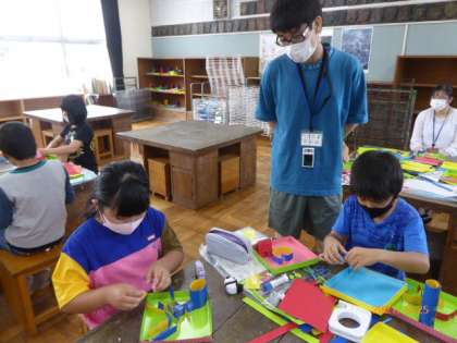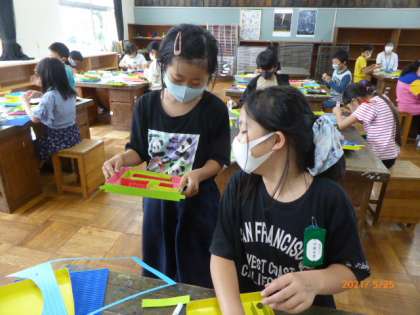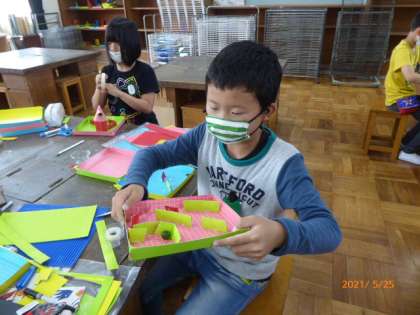 4年2組の図工「コロコロガーレ」の様子です。段ボールを切って土台に貼り付けて迷路をつくりました。