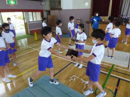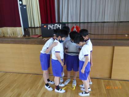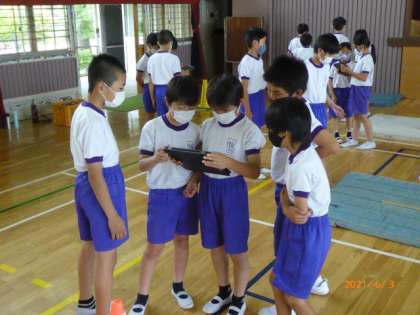 5年1組のマット運動の続きです。撮影した動画はすぐに本人とみんなで確認して、思った通りにできているかどうか、客観的に分析しています。