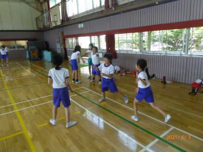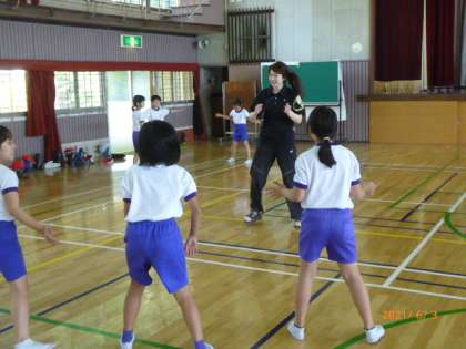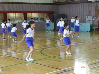 4年2組は体育でダンスをしています。決まった振り付けがあるようではなく、音楽を聴いて感じたままに体を動かすようです。学園天国、サンバ、島唄が続けて流れて、それに合わせて踊っています。