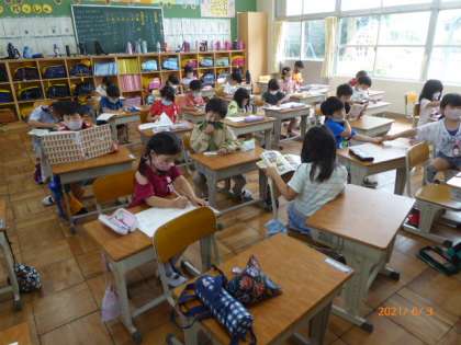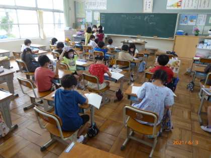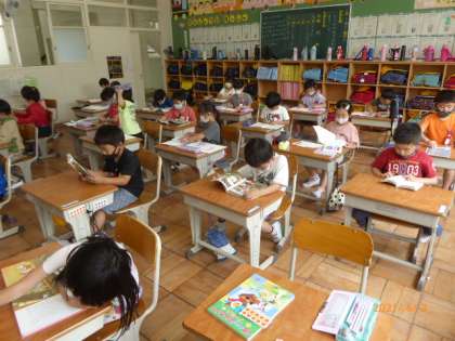 木曜日の給食後の委員会の時間では、1〜3年生は読書タイムです。1年生はなかなか読書に集中することができず、立ち歩きなどもありましたが、今日は読書をしたり、お絵かきをしたりしながら落ち着いて過ごしています。