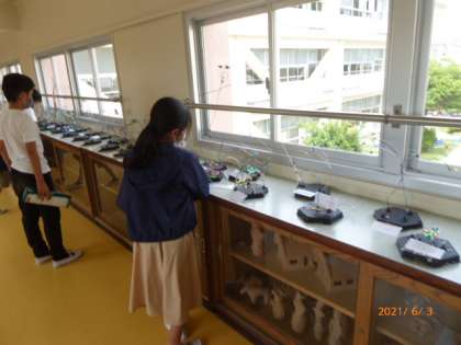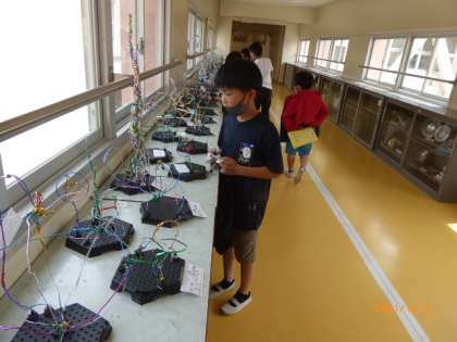 昼放課に2階渡りにいますと、通る児童たちが足を止めて、5年生の図工作品を見ています。その様子を紹介します。