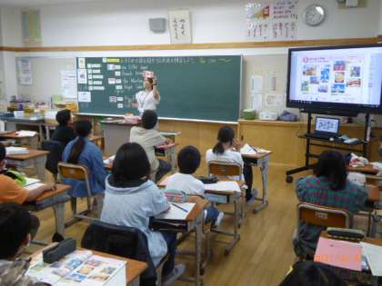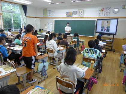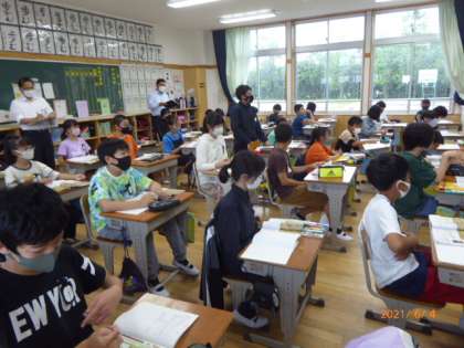 学校訪問での6年生の様子です。6年1組は社会科で長篠合戦図屏風をもとに鉄砲などの新しい武器による戦い方の変化や工夫について考えました。6年2組は外国語で、旅行を勧める表現を使いながら、お勧めする理由も加えて話しました。
