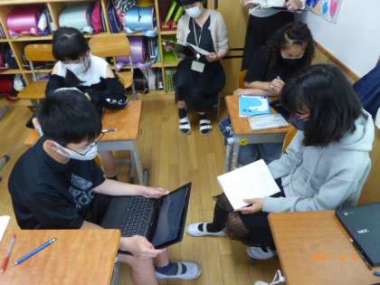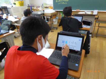 学校訪問の6年生の様子です。6年2組で特別に研究授業を行いました。算数で分数×分数の計算はどうなるか、タブレットを使いながら考えました。