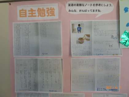 4年1組の廊下には優秀な自主学習ノートのコピーが掲示されています。このお手本を参考にして、よい自主学習のしかたを学んでくださいね。