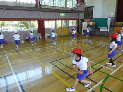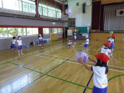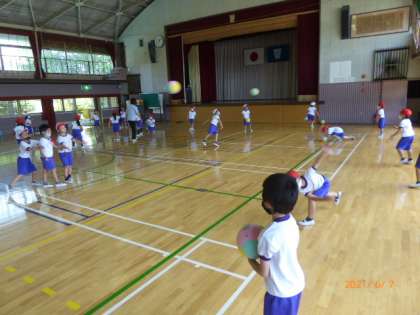 1年生は体育館で、ソフトバレーボールを使ってボール遊びをしています。最初は1人一つずつボールを持って投げ上げたり、床についたりしていましたが、半分のボールを戻して、2人1組になってお互いにボールを投げてキャッチしています。両手でふわーっと投げていたり、片手でびゅーんと投げていたり、投げ方はいろいろです。