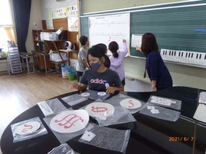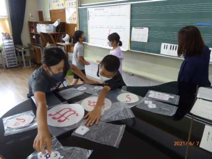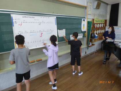 5年2組は音楽の授業で「クラップフレンズ発表会」をしています。手拍子だけで演奏するリズム曲ですが、そこに自分たちで考えて強弱をつけます。大きく拡大した楽譜に音楽記号を貼り付けていきます。