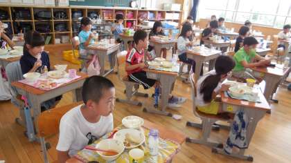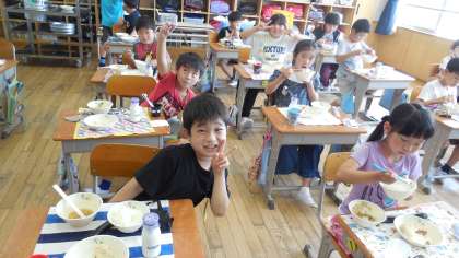 3年生の給食の様子です。みんなおいしそうに食べています。こめこのほきフライは、ころもがかりっとしていて、中の白身がふんわりやわらかくて、とてもおいしかったです。甘辛いたれをからめた、だいずのアーモンドがらめは、しっかりかみ砕いて、味わいました。ごちそうさまでした🎵