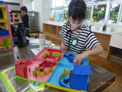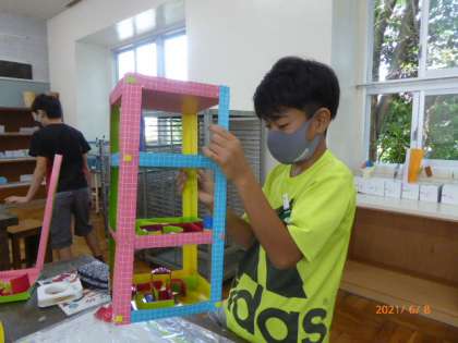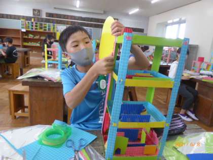4年1組は図工「コロコロガーレ」でいよいよ迷路を完成させます。みんな真剣な表情で取り組んでいます。