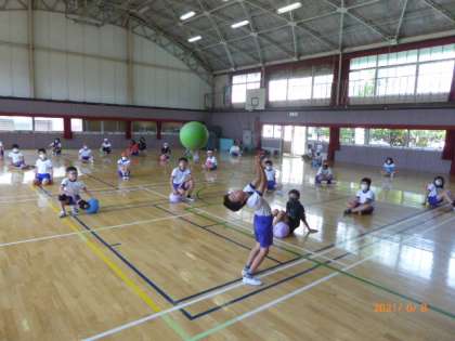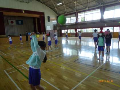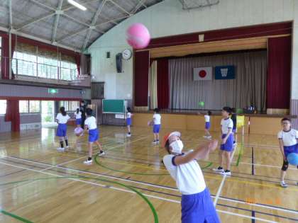 6年2組のバレーボールの続きです。今度は後ろ向きになって、アンダーハンドでボールを後方にパスすることに挑戦です。