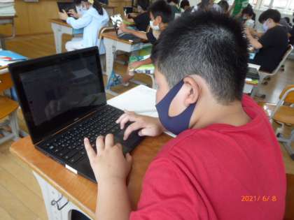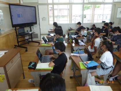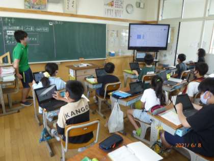 6年1組の分数×分数の計算の続きです。発表をするときには、発表者の画面を電子黒板に映し出して説明を聞いています。