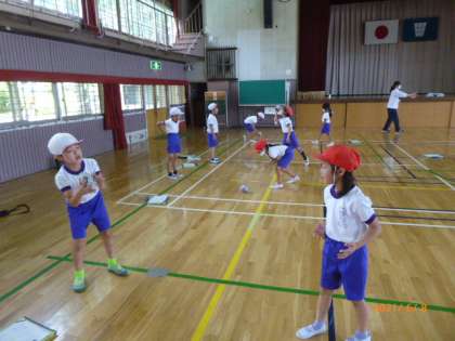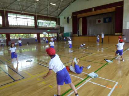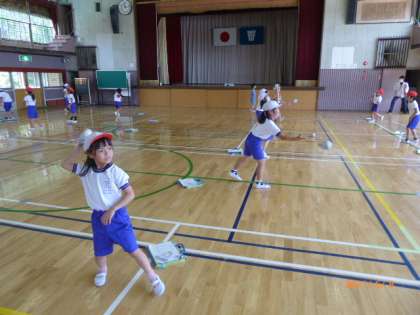 2年2組は新聞紙を丸めて作ったボールでキャッチボールをしています。上から投げても、下から投げてもOKです。新聞紙ボールなので、あたっても痛くないので怖がらずに受け止めることができます。投げる側も思い切って投げています。
