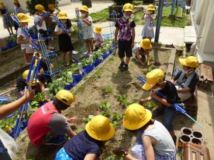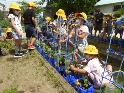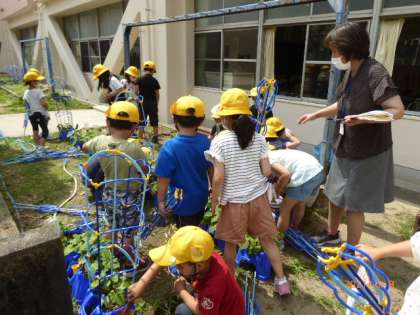 1年生は生活科でアサガオの世話をしています。もともとポットには種を5つまいてありました。今日はそのうち元気な2つを残して、他は間引きました。残した2つには支柱を取り付け、間引いた苗は花壇に植えました。「持って帰りたい〜」という児童もいます。