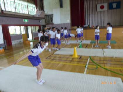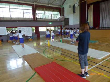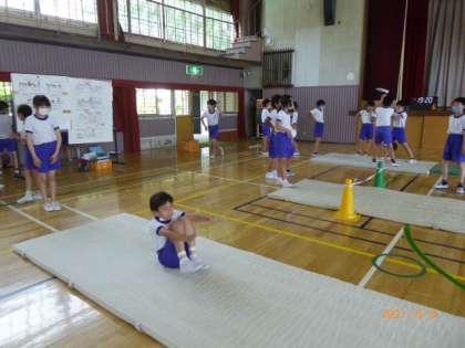5年1組のマット運動の続きです。1か所で先生がテストをしています。自分が演技する技を先生に伝えてから挑戦します。立ち上がった後の決めポーズも重要です。