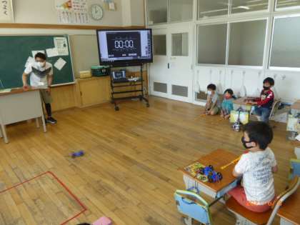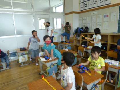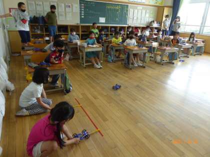 3年2組は理科でゴム車の実験をしました。ゴムを伸ばす長さを変えながら走行する距離を測定して、関係について勉強しました。そのあとでゴム車を走らせる遊びをしました。教室の中にいくつか枠を作って、そこに車が止まったら得点です。めざす枠の中にちょうど止めるには、ゴムの長さをどれくらいにしたらよいか考えなければなりません。これはよい勉強になりますね……