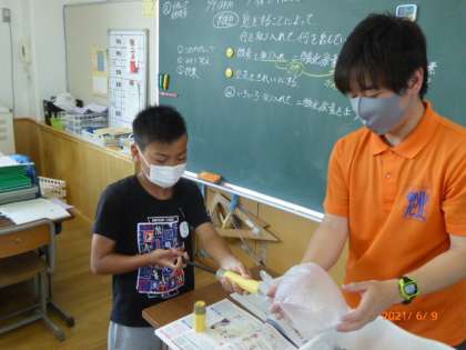 先生がビニル袋に息を吹き込み、その空気に含まれる二酸化炭素の割合を調べました。