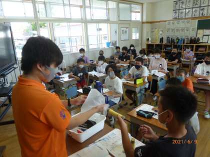6年1組は理科の実験をしています。息をすることで何を取り入れて、何を出しているかを調べます。空気中の酸素や二酸化炭素の割合を調べる器具を使いました。