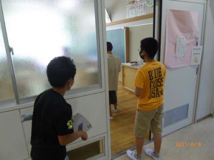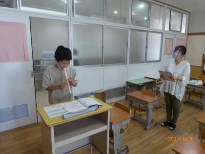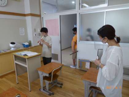 6年2組はリコーダーのテストをしています。感染予防対策として、別室で一人ずつのテストです。先生はマスクに加えてフェイスシールドもしています。これまでの授業では音を出してこなかったので、演奏を聴くのはこれが初めてになります。