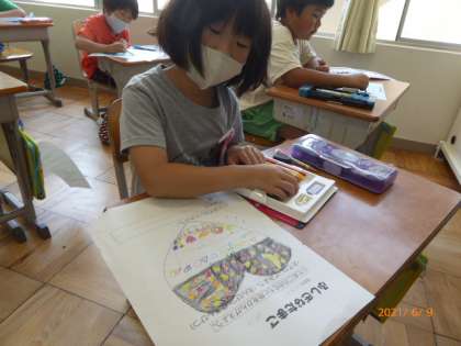 2年1組の図工「ふしぎなたまご」の続きです。ただ好きなように、ではよいものが生まれてきません。色の組み合わせとして、子どもたちから意見を集めました。
