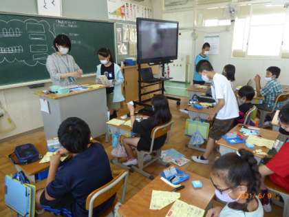 電子黒板では30分間ずつ、本返し縫い、かがり縫い、ボタン付けの動画を流しています。できあがった作品を先生に見せて合格がもらえると、ノートにスタンプを押してもらえます。