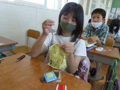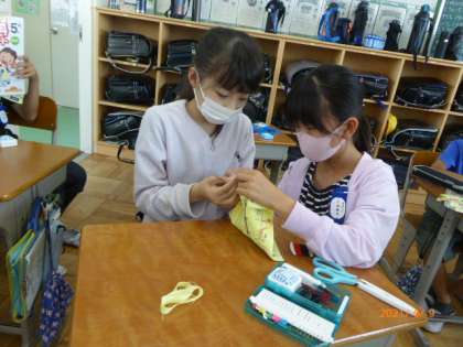 5年1組は家庭科で裁縫の特訓中です。数々ある「ミッション」をクリアすると、小物づくりに挑戦できることになってます。
