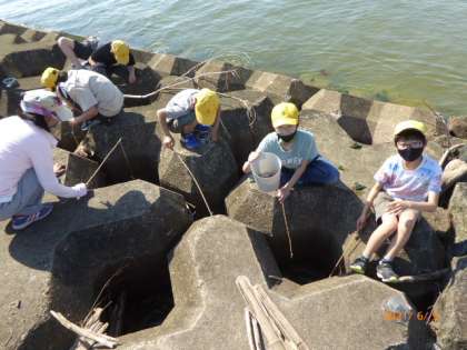 クラブ活動の続きです。室外スポーツ、ドッジボール、昔の遊びです。ドッジボールは教育実習生さんが張り切ってます。昔の遊びは海岸でカニ釣りをしています。
