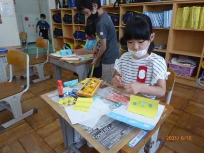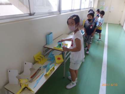 1年生の図工「おってたてたら」の続きです。できた作品は廊下のテーブルの上に並べました。