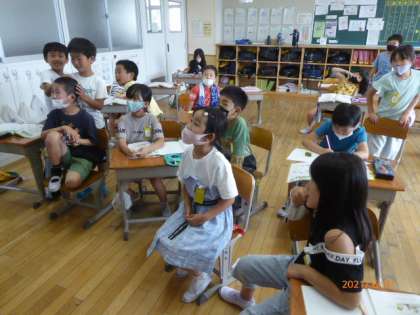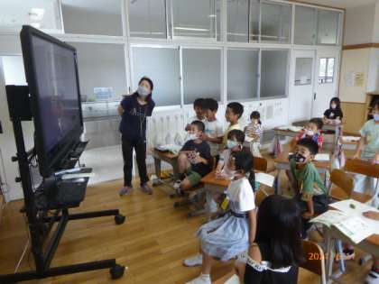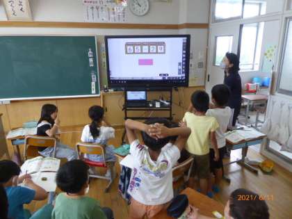 3年1組は算数で、2けたの足し算、引き算を暗算で計算することを勉強中です。考え方を教科書で習った後で、実際にやってみています。電子黒板が自動で次々と問題を出しますので、それを見て口々に答えを言っています。10秒ほどすると正解が表示されます。