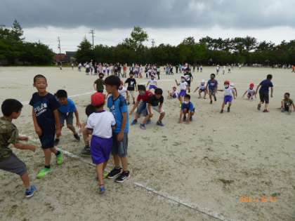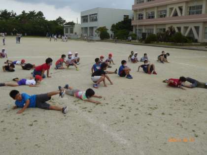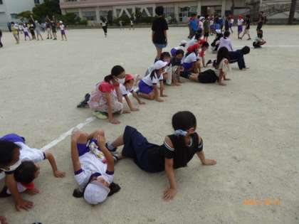 2年生と5年生のペア遊び「だるまさんが転んだ」です。いろんなポーズで止まってますね……